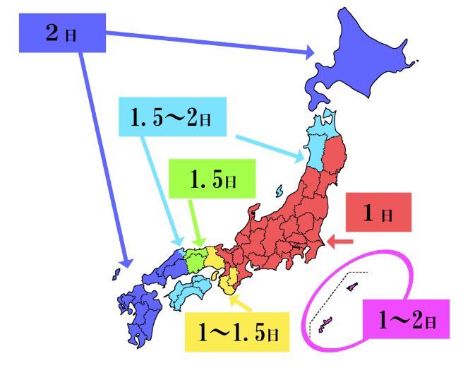 発送から届くまでの日数は、場所によって必要日数が変わってきます。